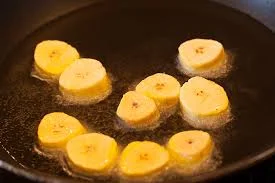 Peel plantains and slice both plantains into about 1/2 inch slices.